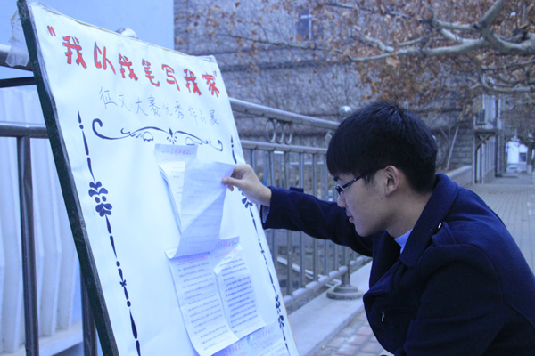 11月26日,机电工程系“我以我笔写我家”征文大赛揭晓获奖名单,并将获奖作品于小篮球场东侧以展板形式展出。机械电子14—1班彭娜获得一等奖。