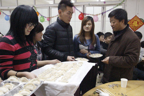本次活动以包水饺为主,另外还有一些精彩的小节目。对于包水饺,同学们跃跃欲试,准备大干一场。当工作人员把所需物品端上桌后,同学们立刻行动起来,三位老师也参与其中,场面其乐融融。经过大家齐心协力,一个个奇形怪状而又包含同学们真情和创意的水饺被包了出来,最后由老师评出了一、二、三等奖。