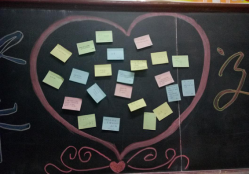 团支书刘欢带领班级同学开展“放飞青春,追逐梦想”的主题书写活动,组织委员和宣传委员在黑板上画了一颗红色的心,寓意着计科16-1班团结一心。然后全班同学拿着发放的便利贴让同学认真的写下自己的梦想,红心内满载着大家对未来的憧憬,更承载着大家对当下的构思。