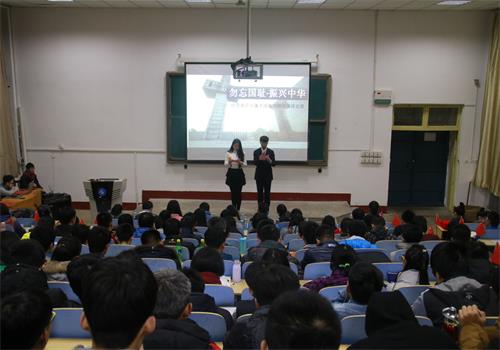 首先,由高姣姣老师做开场演讲,抒发对南京大屠杀的痛心,希望我们不忘国耻,铭记“落后就要挨打”的历史教训,刻苦学习,努力向上,让悲痛历史不再重演。决赛在朱子超饱含深情的《全倾全力,为我中华》中拉开了帷幕,张译铭同学的《牢记历史,珍爱和平,不忘过去,开创未来》;警钟长鸣,悠悠回响;王欣茹同学带来《民族之殇,未来之警》;浩荡祖国,巍巍华夏;刘兰聪带来《立爱国之志,成报国之才》……雄壮的背景音乐久久回荡,为中华之崛起而读书的誓言也响彻云霄。八位选手感情充沛,声音激昂,抑扬顿挫。用感情与声音带我们回忆历史,铭记历史。听者内心悲痛,眼眶含泪。由此唤起我们内心的爱国热情,铭记历史,勿忘国耻。接着,比赛进行第二环节“诗歌朗诵”。一首首爱国诗歌,低沉而又优雅的表述对祖国那深切的爱意。带领观众进入一种忧伤而又祥和的氛围。然后是现场的互动环节,学生们积极发言。表达对南京大屠杀深切的悼念以及努力学习,为国家做出贡献。最后,信息系党总支副书记裴国栋发表讲话:让我们带着沉重心情记住这个日子,不忘历史,不是为了记住仇恨,是为了珍惜和平,周恩来为中华崛起而读书,奉献自己的一生。我们要过的充实不辜负新时代,不忘记父母的嘱托,努力进取,练好技能。串场节目中,殷齐森同学带来的歌曲《红旗飘飘》和王天宇同学带来的《我是中国人》也引起阵阵喝彩。经过一个多小时的激烈角逐,最终张译铭同学获得了本次比赛的一等奖,刘兰聪、王欣茹、王冉获得本次比赛的二等奖,朱子超、刘汝月、庞惠娟、李娅琳获得本次比赛的三等奖。比赛结束后,选手与嘉宾、工作人员合影留念。