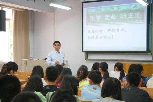 朱景星先是就升学考研中需要注意的问题进行了总结,同学们要选择自己感兴趣的专业,并展示了信息系近两年毕业生的考研情况,鼓励有考研想法的同学们不要放松自己,努力奋斗,敢于挑战自己,不要为自己的人生留下遗憾。接着根据当前就业形势和信息系近三年的就业情况,分析了2015届毕业生严峻的就业形势,同学们在就业中要有一个正确的心态。并简单总结了参加招聘会、参加公务员等考试、参加订单培养和学分置换计划以及自主创业等各种就业途径,让同学们对自己要走的路更加的清晰明确。最后,朱景星对同学们寄予厚望,鼓励同学们立足现在,脚踏实地,创造属于自己的辉煌明天。