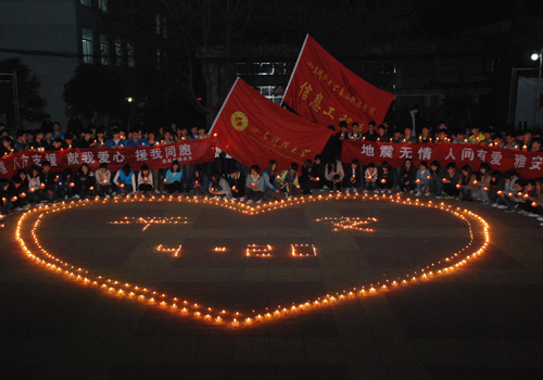 活动现场,一张张写满鼓励雅安人民坚强的卡片,一排排蜡烛排列成的“4.20”字样和心形图案,拉出的“一方有难,八方支援,献我爱心,援我同胞”的横幅,一个个庄重的签名,都传递着大家对灾区人民的关心与支持。晚上8时02分,广大师生怀着沉重的心情为雅安同胞集体低头默哀,虔诚的哀悼是对雅安人民不幸的缅怀,真挚的祝福是对雅安人民早日走出悲痛的祝愿。