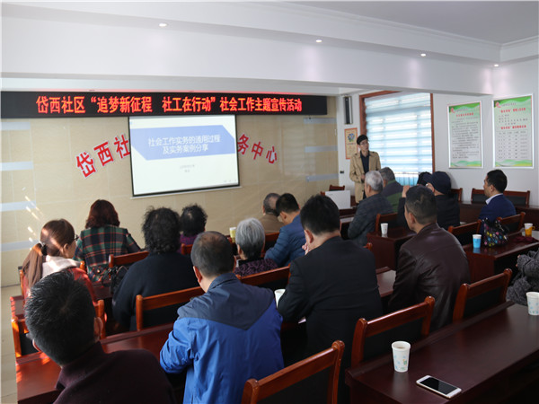 2019年3月23日上午,泰安市泰山区岱西社区在社区讲堂召开“追梦新征程 社工在行动”社会工作主题宣传活动。文法系社会工作教研室桑爱友主任、周海明老师及张乐老师受邀参加,为社区工作人员、党员及居民做主题讲座,讲解社会工作理论知识、传授社会工作实务方法、宣传社会工作价值理念,让居民们真正了解社会工作、熟悉社会工作、认可社会工作。