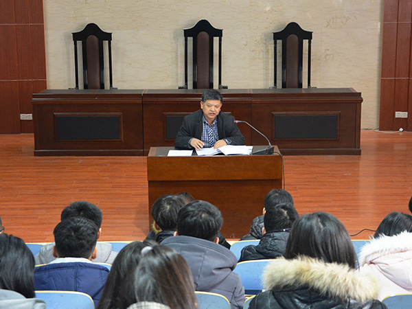 12月27日上午,文法系在模拟法庭举行“三风建设”主题班会,行管17-1班、17-2班全体同学参加。班会由文法系党总支副书记刘相明主讲。