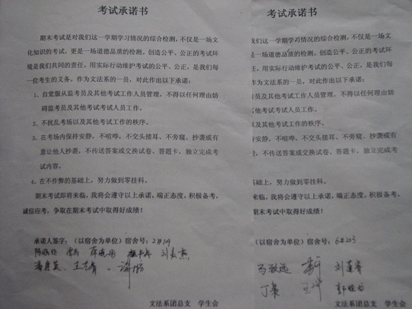 俗话说得好:人无信不立。诚信对一个人的成长成才乃至立业来说尤为重要。为了进一步加强学风建设,营造一个公平、公正的考试环境,用实际行动维护考试的公平,近日,文法系团总支和学生会通过召开诚信教育主题班会,发放《诚信考试倡议书》,签订《考试承诺书》和制作宣传展板等多种形式加强考风考纪教育。