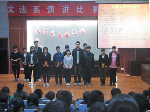此前在10月18日举行的初赛中,周芬芬、郭超圣等10位选手成功晋级决赛。赛前,10位选手分别向观众做了自我介绍。在第一环节中,选手按规定以“追寻成长的足迹”为话题,自拟题目,进行3—4分钟的演讲。选手们用慷慨激昂语言的感染着台下的每一位观众,选手们对于成长都给出了自己的见解。第二环节中就是要求选手必须现场揣摩各大演讲名家的情感,感受当时演讲人所处的氛围,明确清晰地表达出演讲人的主张。第三环节,即兴演讲,主要考查选手的随机应变、语言组织能力以及对现场突发情况的处理能力。针对本次活动中选手们的表现,刘明远老师做了点评,他指出了选手的优点和存在的不足,希望大家在日常的生活中要加强对普通话的训练。为以后升学就业打下坚实基础。最终,来自文秘12-1班周芬芬夺得了本次演讲比赛的一等奖,郭超圣,王晶竹获得二等奖。