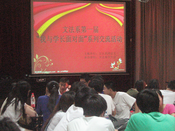 6月13日下午,由文法系团总支主办、文法系学生会承办的第一届“我与学长面对面”系列交流活动之一“寄语与祝福”在文秘情景实训室成功举办。活动由刘明远老师主持,特地邀请我系2008级法学和行政管理专业优秀毕业生与低年级同学交流,帮助他们明确努力目标和努力方向,改进学习方法,从而促进自身全面发展。