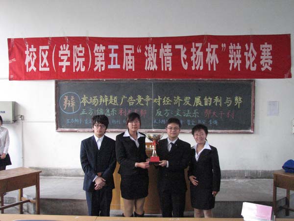 5月11日下午,由校区(学院)团委主办、文法系承办的第五届“激情飞扬杯”辩论赛第三场比赛在1A#107教室举行,两课教研室范正新老师、信息系尹德峰老师和文法系桂自品老师担任评委,校区(学院)团委甄惠老师、文法系团总支书记郭涛林和经管系刘明远老师到场观看了辩论赛。