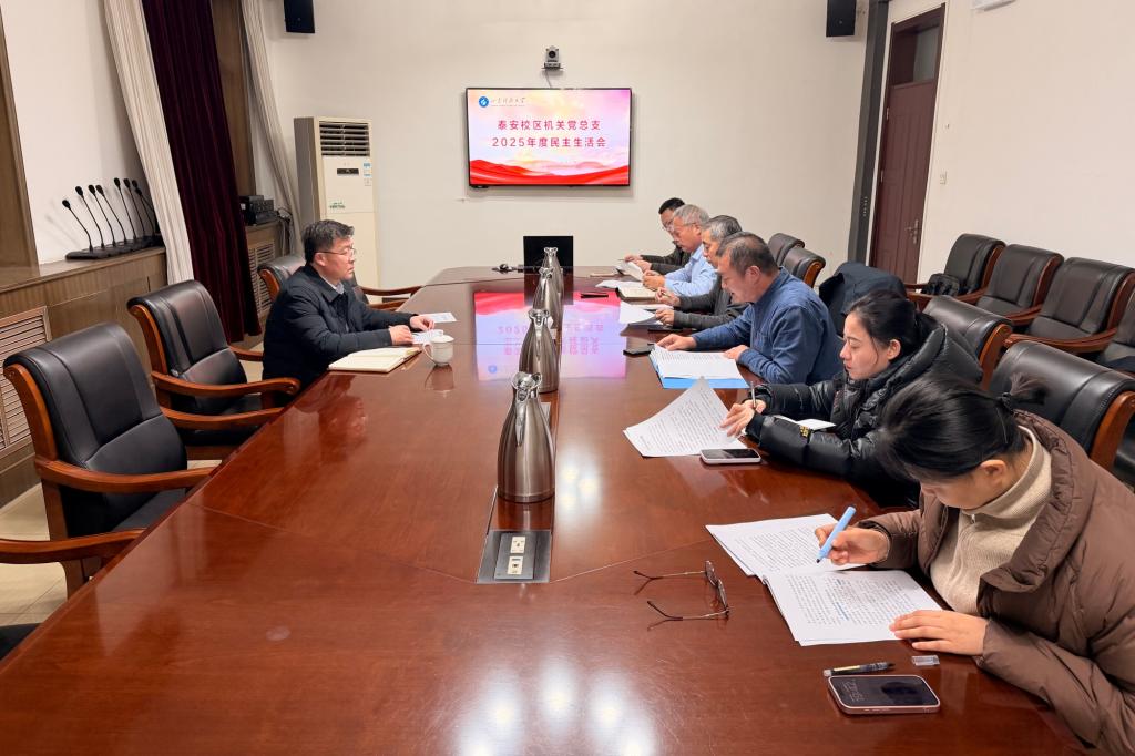 2月3日,泰安校区机关党总支召开 2025 年度班子民主生活会。泰安校区党委书记吴正龙到会指导,机关党总支书记殷永贵主持会议,党总支班子成员参加会议。